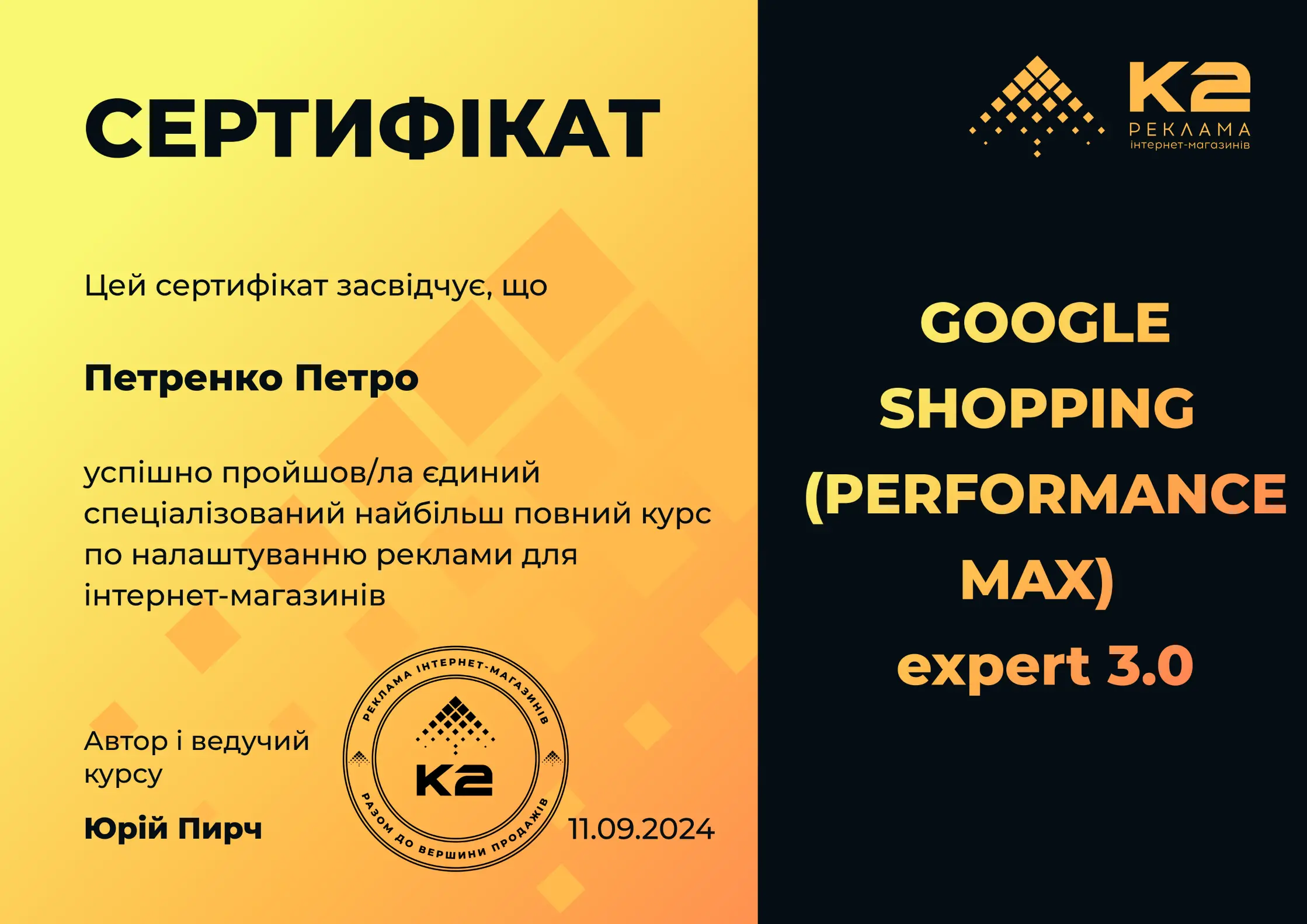 Після проходження 100% курсу ви отримаєте сертифікат експерта з налаштування товарної реклами від Академії К2.